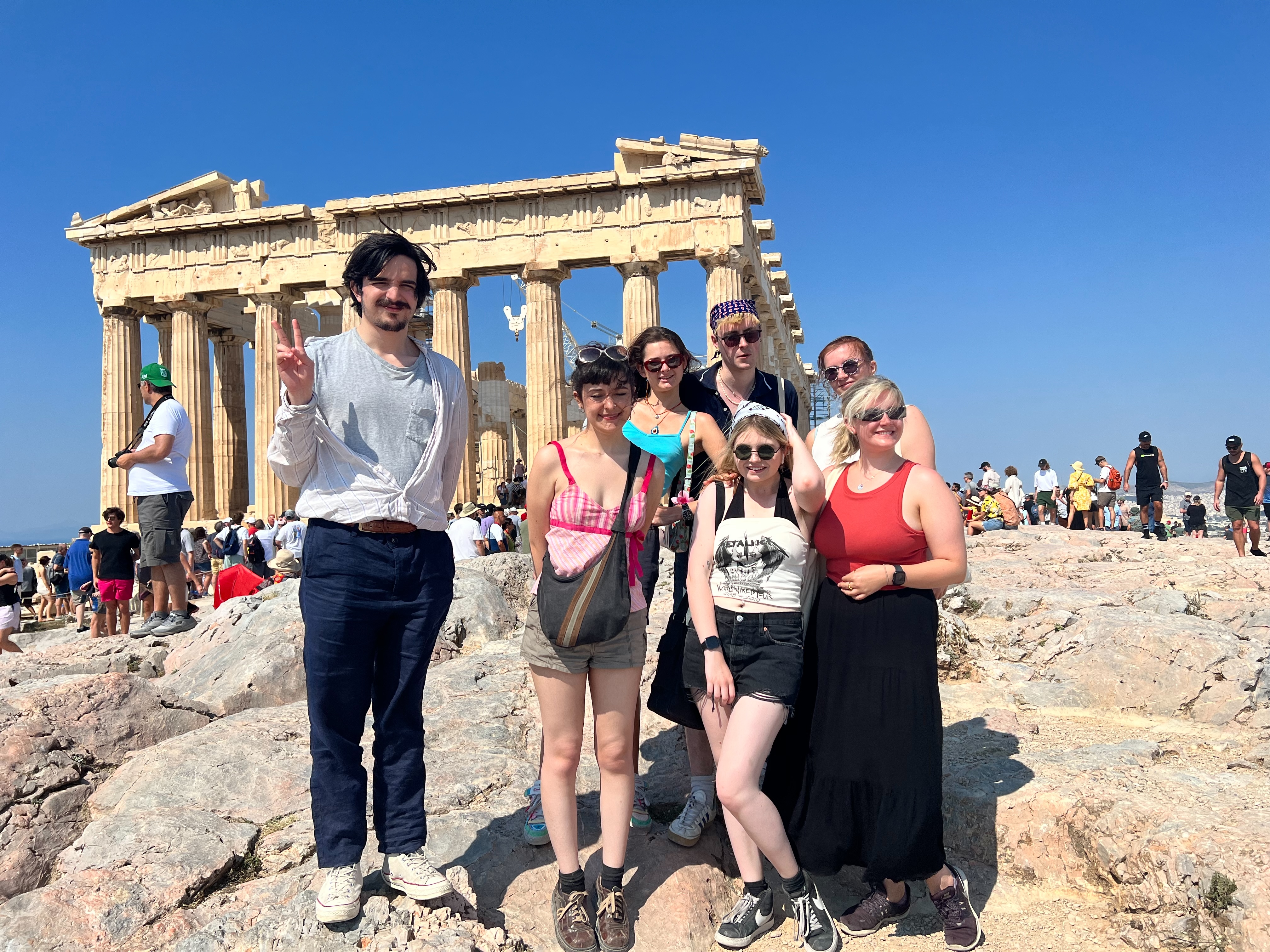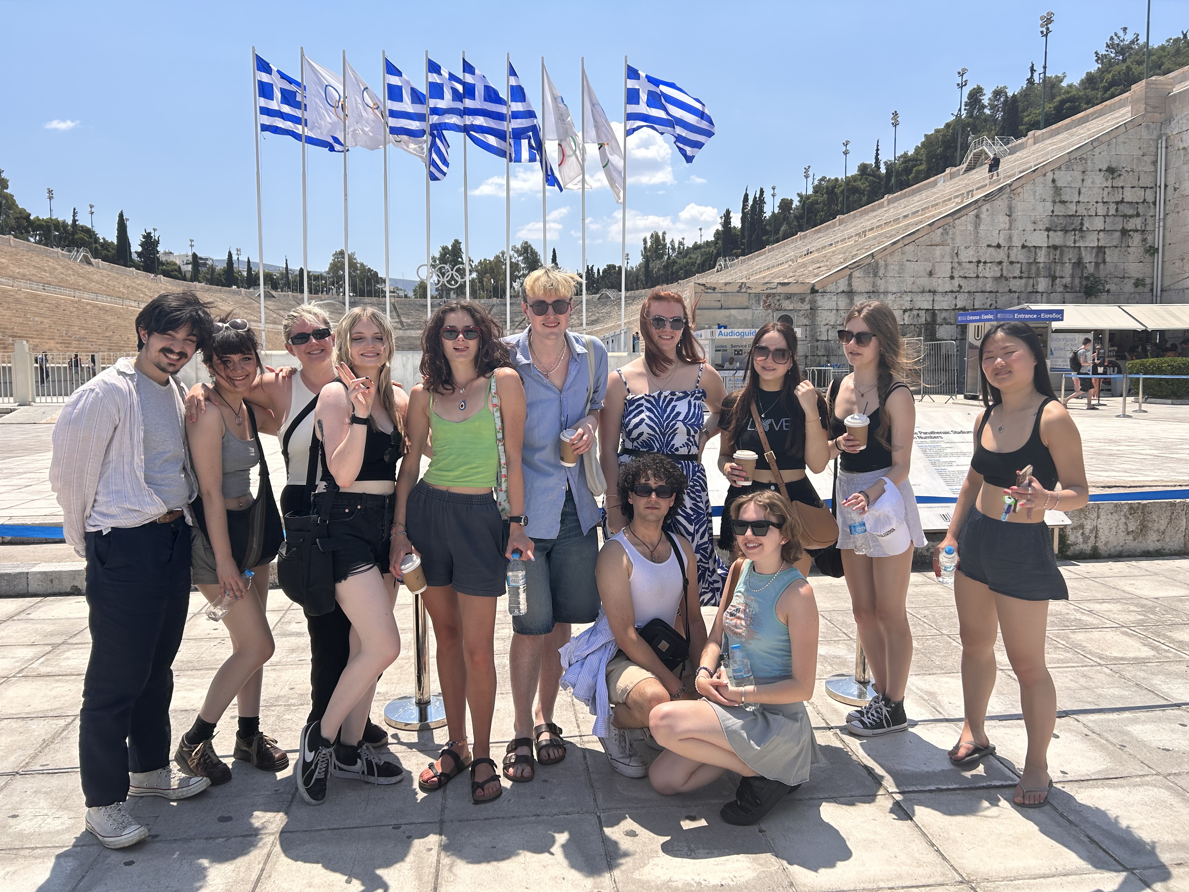 A recent fully funded five-day visit to Greece for fourteen students of the Classics Department was made possible by the generosity of the Jamie Rumble Memorial Fund. The student trip took place in late June 2023, and focused on the highlights of Athens, ancient through modern. Koraes Professor Gonda Van Steen led the fieldtrip, which was part of her undergraduate module ‘Adventures in Ancient Greek Drama’. The fourteen participants visited museums and sites, with a focus on classical drama and art and architecture. In addition to the must-see sites of Athens (Theatre of Dionysus, Acropolis, ancient art museum), the students also visited the spectacular Basil and Elise Goulandris Foundation Museum, where they enjoyed a guided tour of major works of art in the collection. Also, they found themselves shopping for fresh fruits and vegetables at the colourful Friday farmers’ market in Pangrati and enjoyed interacting with the local coffee shop owners. The students liked staying in the modern student apartments provided by The Athens Centre, which added to their living experience of a residential neighbourhood in downtown Athens. Some apartments offered spectacular views of the mountains and the sea, and they became evening gathering hubs. Several students managed to fit in late afternoon beach visits as well, since the weather was perfect for swimming and sunbathing. Everyone returned safely and satisfied. We are grateful to the generous sponsor for making the 2023 Rumble trip possible.