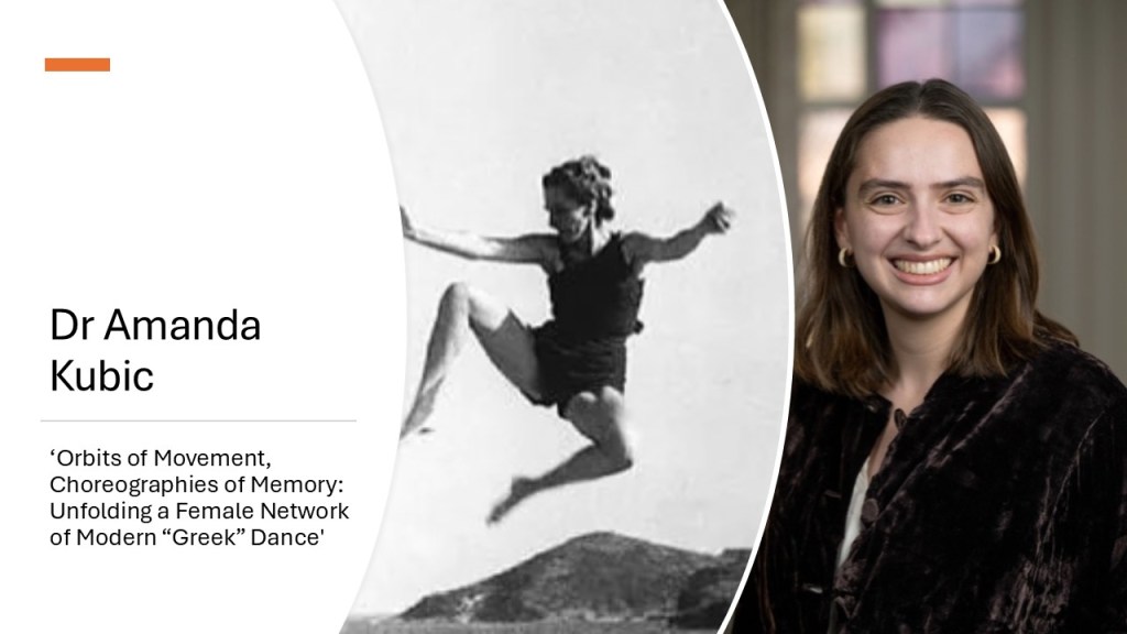 5 March 2026, 18:15pm (London time), Senate House (Malet Street, London, WC1E 7HU), Room 104: Dr. Amanda Kubic: ‘Orbits of Movement, Choreographies of Memory: Unfolding a Female Network of Modern “Greek” Dance’.
